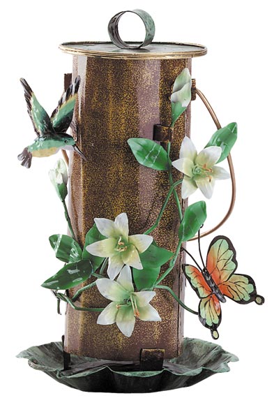 Clinging vines and blossoms attract a butterfly and hummingbird