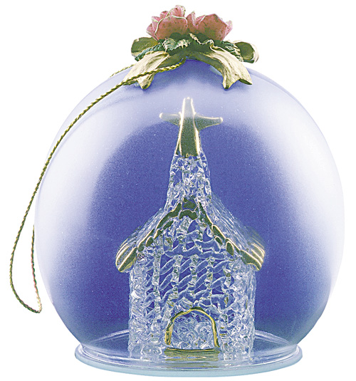 Spun-glass church with sky-blue background inside ornament
