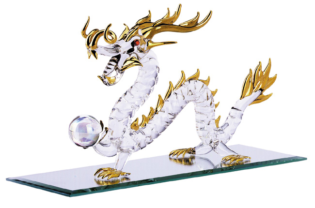Spun-glass dragon with red crystal eyes, gold-plated detail on mirror base