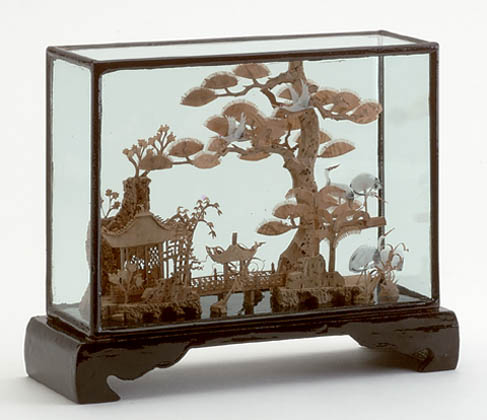 A lovely bridge is the centerpiece of this intricate cork sculpture