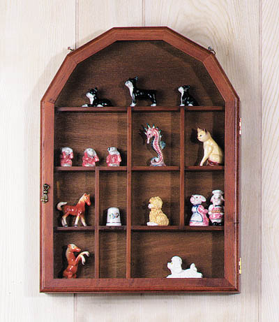 Wall-mounted, wooden, arch-shaped curio hutch features 11 glass enclosed