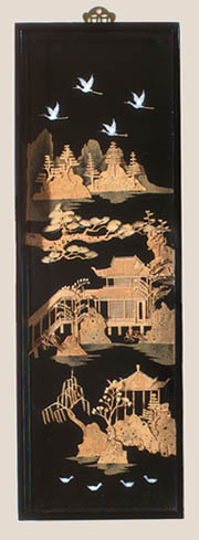 Intricate cork sculpture wall unit depicts mountains, trees, pagodas and birds.