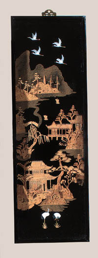 Dramatic cork sculpture seaside scene features boats, pagodas, trees, birds