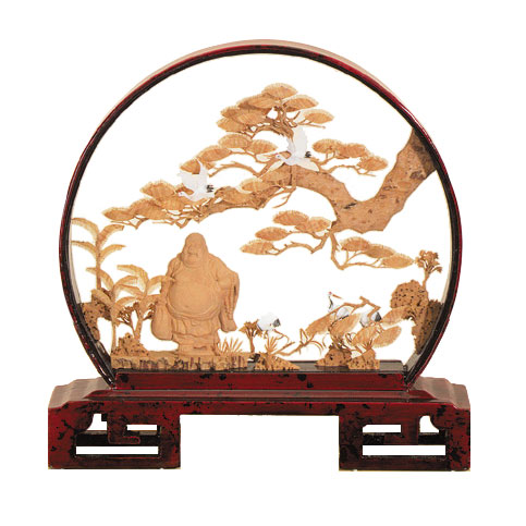 in this charming cork sculpture. Red glass case, highly lacquered with a carved base.